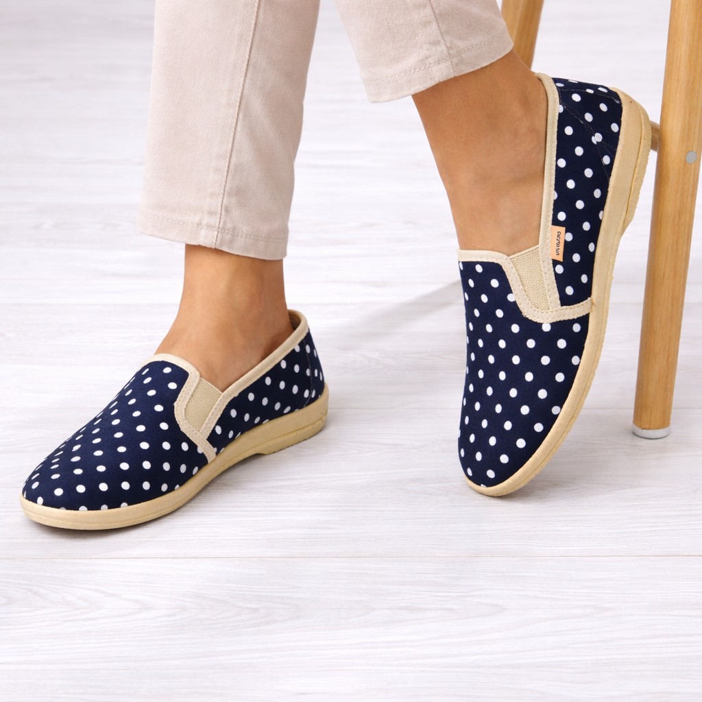 Kapcie damskie wsuwane w grochy – lekkie i wygodne pantofle domowe slip-on
